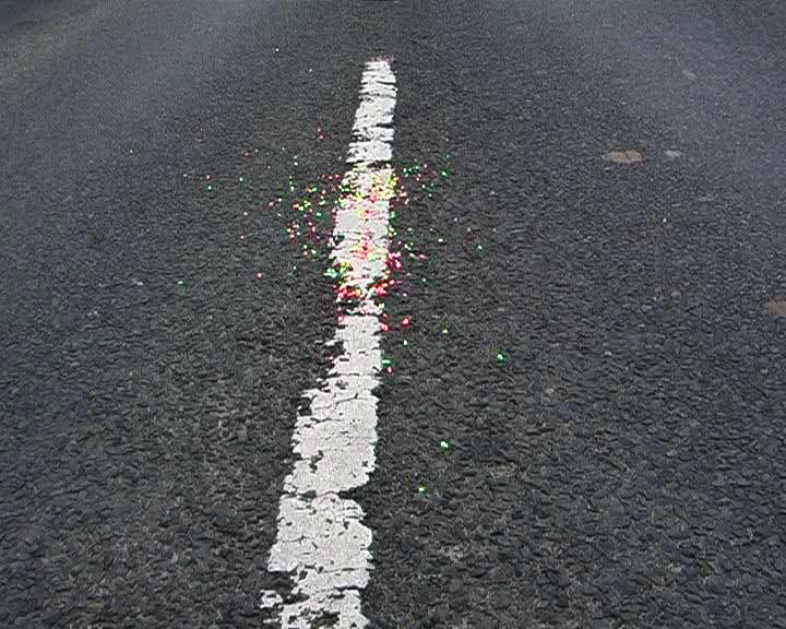 Trois plateaux de verre teinté alignés, couchés au sol. Leur disposition correspond au caractère typographique des points de... suspension. Une revue « Laura » n°28 (dernier tirage à ce moment-là) est posée sur chacun des plateaux qui redeviennent tables. La couverture du magazine porte l’image reproduite de « Elle », 1992, photographie avec lettrage peint à l’huile. Cette reproduction éditée en série par la revue, d’une œuvre originale de Rodrigo López Cuenca, expose en abîme l’appropriation faite d’un portrait de M. Duchamp travesti en Rrose Sélavy dû à Man Ray (1921). S’agissant de la revue, chaque exemplaire posé, quoique réplique du même, est objet distinct. De là l’avantage d’un espacement séparateur pour les présenter (ceci d’autant que le palindrome ELLE sème un trouble). Un verre vidé du bar d’en face place sur cette scène un genre d’autoportrait « in situ ».