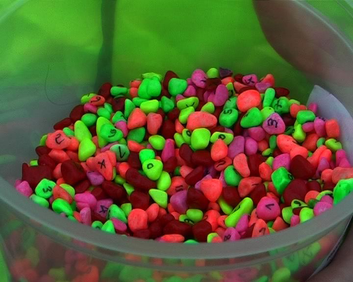 Sur les vitres : alternance de lettres autocollantes bleues et rouge.